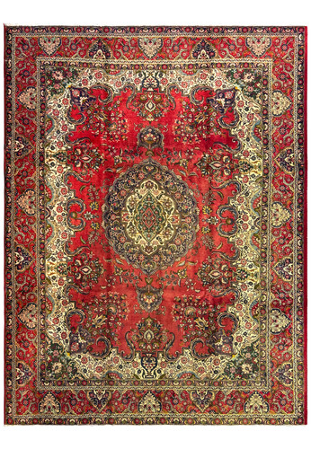 This exquisite 10'4" x 13' Distressed Persian Kerman Rug showcases the timeless elegance and intricate artistry of traditional Persian rug weaving. The rich red field is adorned with a central medallion surrounded by an array of floral motifs and ornate patterns in hues of cream, green, blue, and gold. The intricate border complements the central design, featuring a series of delicate floral and vine patterns. This rug's distressed finish adds a unique vintage charm, making it a stunning centerpiece for any sophisticated interior.