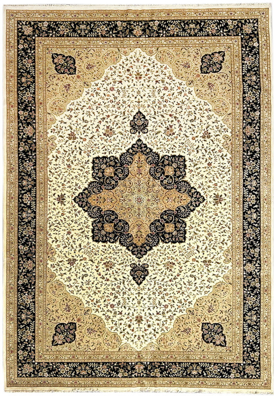 Craftsmanship: Woven with a blend of premium wool and silk on a strong cotton foundation, this Persian Tabriz rug exemplifies durability and luxury. The use of silk accents not only enhances the rug's aesthetic appeal with a subtle sheen but also adds to the definition of its detailed motifs, ensuring that each element stands out with clarity and elegance.