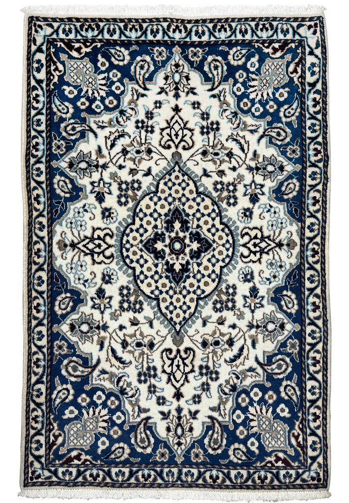 This refined 2'9 x 4'6 Persian Nain rug presents a breathtaking balance of classical symmetry, crisp detailing, and a regal color composition that defines the finest traditions of Nain weaving. The composition is anchored by a dramatic royal navy blue frame that surrounds a luminous ivory field, creating a striking layered contrast that immediately draws the eye inward.