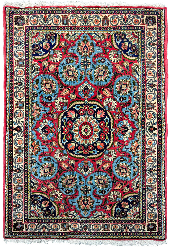 This particular Bijar rug showcases a vibrant and rich color palette, dominated by deep reds and majestic navy blues that are symbolic of the opulence and grandeur of Persian design. The central medallion, a classic hallmark of Persian rugs, stands out in an alluring shade of cerulean blue, encircled by intricate floral motifs and embellished with hints of ivory, coral, and olive green that add depth and complexity to the design.