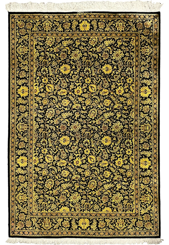 The color palette of this rug is deliberately bold and reduced to two primary tones: a deep, pure jet black field and a brilliant, luminous golden yellow that covers every motif across the entire surface. The black ground is a true, saturated near-black with no grey or brown undertones, providing the maximum possible contrast against the golden floral work. The golden yellow of the motifs is bright and warm, shifting noticeably in intensity as light moves across the silk pile, ranging from a vivid lemon-gold in direct light to a deeper antique gold in shadow. This directional light shift is a defining characteristic of high-quality silk pile and gives the rug a three-dimensional, almost glowing quality that flat photography cannot fully capture. Warm amber and dark brown tones appear as shading within the flower heads, leaf bodies, and vine curves, adding depth and modelling to the motifs and preventing the design from reading as flat or graphic at close range. The border maintains the same black and gold palette, using the same golden yellow for the floral vine and the same dark brown accents for shading detail. The overall effect is one of maximum visual drama and opulence, a rug that reads as bold and luminous from across a room while revealing intricate detail at close range.
