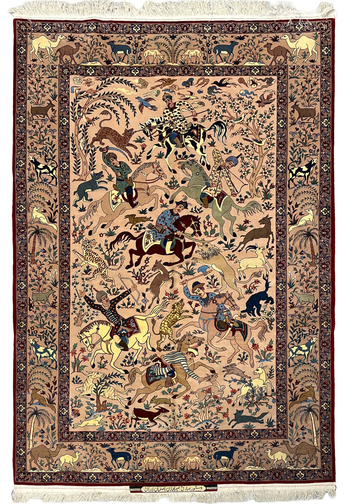 This exceptional hand-knotted Persian Isfahan rug by the Seirafian atelier measures 5 x 7'7 and represents one of the most prestigious formats in all of Persian weaving: the Shikargah, or royal hunting scene. Woven at approximately 600 knots per square inch on a pure silk foundation, this is a piece of extraordinary fineness, with a profile so thin and supple that it handles more like a textile than a floor covering. The wool and silk pile captures an elaborate composition of mounted royal hunters, wild animals, flowering trees, and birds across a warm blush rose ground, all rendered with the precision and artistic control that has made the Seirafian name one of the most respected in Isfahan rug production. The piece is in excellent, never-used condition and bears the master weaver's signature.
