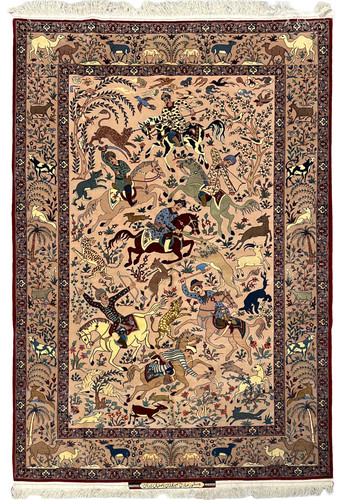 | Style: | Fine Persian Isfahan Seirafian Shikargah royal hunting scene with horsemen, wildlife, and animal figural border |