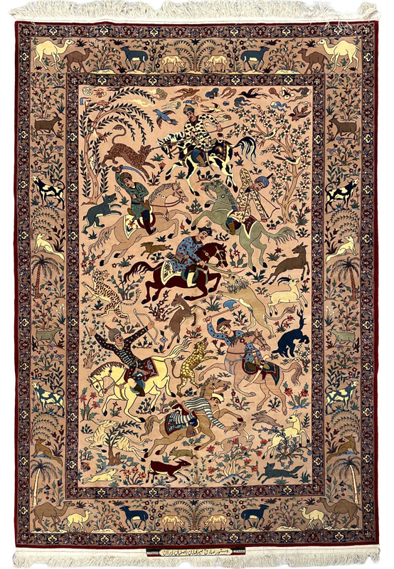This exceptional hand-knotted Persian Isfahan rug by the Seirafian atelier measures 5 x 7'7 and represents one of the most prestigious formats in all of Persian weaving: the Shikargah, or royal hunting scene. Woven at approximately 600 knots per square inch on a pure silk foundation, this is a piece of extraordinary fineness, with a profile so thin and supple that it handles more like a textile than a floor covering. The wool and silk pile captures an elaborate composition of mounted royal hunters, wild animals, flowering trees, and birds across a warm blush rose ground, all rendered with the precision and artistic control that has made the Seirafian name one of the most respected in Isfahan rug production. The piece is in excellent, never-used condition and bears the master weaver's signature.