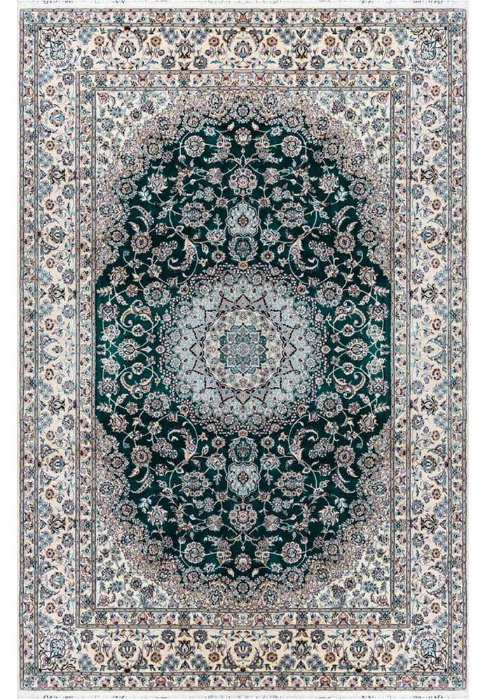 The dominant color of the central field is a rich deep teal green—an unusual and highly desirable tone in Nain weaving. It serves as the backdrop for the floral lattice and enhances the shimmer of the silk accents.