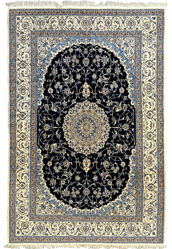 This 6'5 x 10 Persian Nain 6 LA silk rug is a refined example of high-grade Nain craftsmanship, showcasing a midnight navy field centered by an intricately layered ivory floral medallion. The composition reflects classical Persian balance, precision, and symmetry, woven with exceptional clarity and fine silk highlights that give the surface a subtle luminous depth.