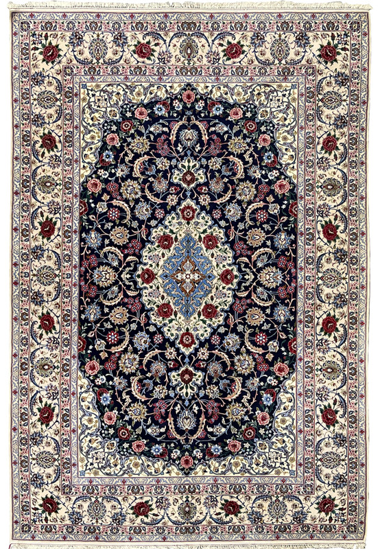 The composition presents a richly layered floral layout anchored by a refined central medallion, surrounded by flowing vine scrolls, palmettes, and delicate blossoms. The symmetry and spacing reflect the disciplined design language Isfahan rugs are known for, while the floral elements remain soft and fluid, creating visual harmony throughout the field.