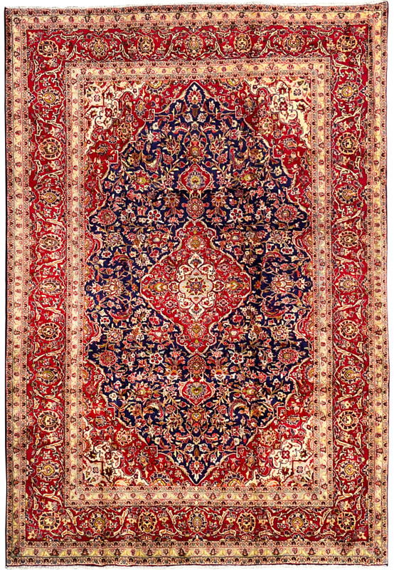 This Persian Isfahan rug showcases the refined artistry that defines classic court-style weaving. Featuring a deep navy field anchored by an ornate brick red medallion, the design is balanced by flowing floral vines and finely drawn palmettes. The composition is elegant, symmetrical, and richly detailed, making it well suited for formal living spaces, dining rooms, or refined offices.