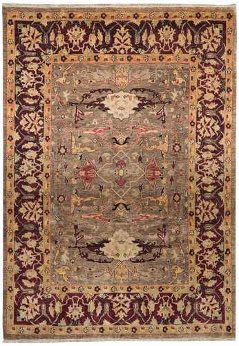 The rug’s field is dominated by soft taupe and beige tones, accented with maroon, rust, ivory, and touches of sage green. The border frames the design with bold burgundy florals outlined in golden yellow, creating both contrast and depth. Each pattern element is drawn from nature—stylized palmettes, scrolling vines, and geometric blossoms—reflecting the region’s connection to organic themes.