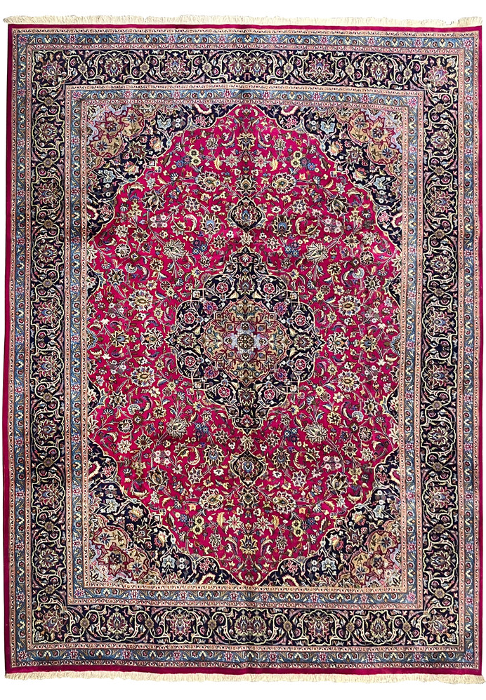 Made in Mashad, Persia, this semi-antique piece exemplifies traditional Persian durability and grandeur. Its scale, balance, and coloration make it suitable for large, formal interiors — from dining and living rooms to grand entryways. As with most Mashad rugs, the blend of color harmony, hand-spun wool, and centuries-old design tradition makes it a timeless work of Persian artistry.