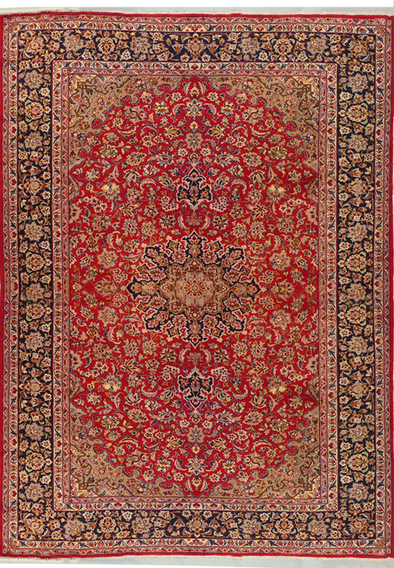 An Isfahan rug normally has an ivory background with motifs that include colors of blue, rose and indigo. The designs are symmetrical and balanced, usually with vines or palmettos that surround a single medallion. The rugs are knotted on cotton or silk foundations, and the pile is of exceptionally good quality, such as Kurk wool. The pile is clipped very low, and the modern versions of the rugs more pastel. The rugs have an extremely high knot density, and the knots are what is known as a Sennah knot.